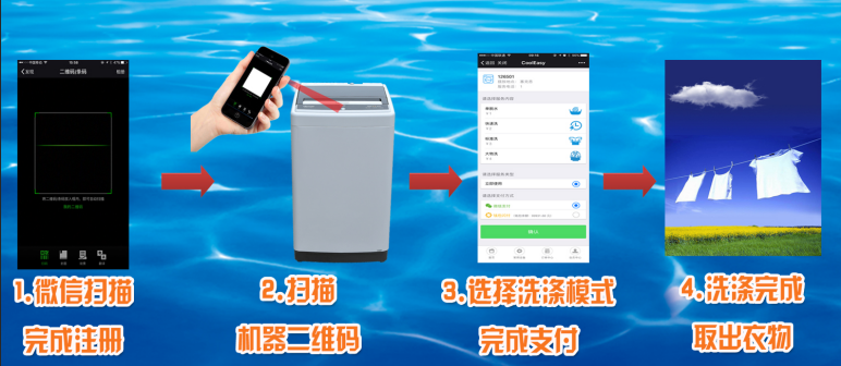 互聯(lián)網(wǎng)O2O自助洗衣機,即用戶通過手機客戶端來了解洗衣房的運轉狀態(tài),可以提前預約洗衣操作。通過掃碼連接相應的洗衣機,可以自由選擇洗衣模式,實時查詢洗衣進度,通過手機接收實時提醒,用戶可以通過客戶端來在線完成支付。